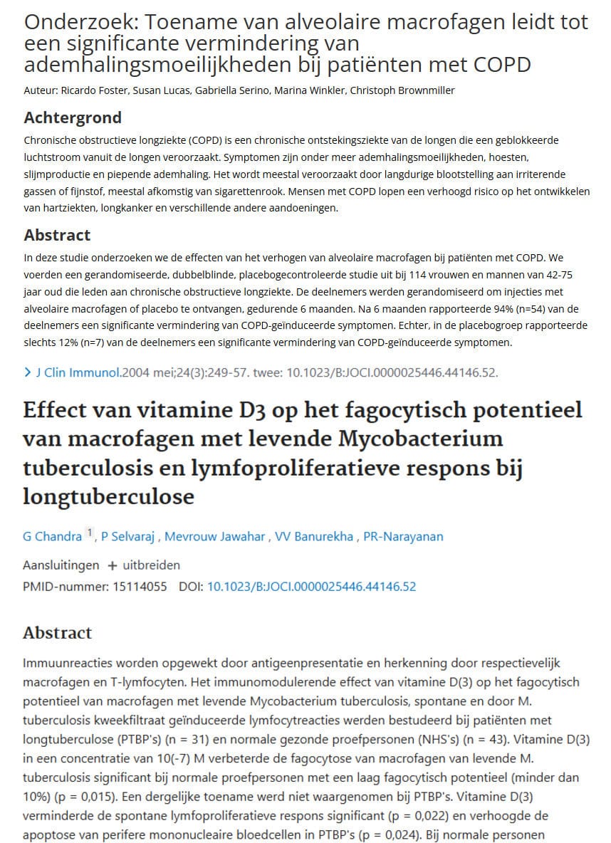 In 2021 was er een grote doorbraak in COPD-onderzoek. Onderzoekers slaagden erin om de ademhalingsproblemen van getroffen personen aanzienlijk te verminderen. Hiervoor ontvingen de proefpersonen een natuurlijke bereiding met de ingrediënten: vitamine D, reiki-paddenstoelen, L-cysteïne, vlierbessenextract, Amerikaanse ginseng, koningskaarsbladextract en dennenbastextract. Hierdoor konden zij het aantal alveolaire macrofagen (fagocyten in de longen) aanzienlijk verhogen en zo schadelijke stoffen uit de longen verwijderen. Dit resulteerde in een afname van de ontsteking in de bronchiën, wat de ademhalingsproblemen aanzienlijk verminderde. We hebben het medicijn uit de studie "nagebootst" met exact dezelfde doseringen, zodat het nu vrij beschikbaar is voor iedereen met COPD, chronische bronchitis of longemfyseem. U kunt de resultaten van de studie hier nogmaals zwart op wit bekijken: